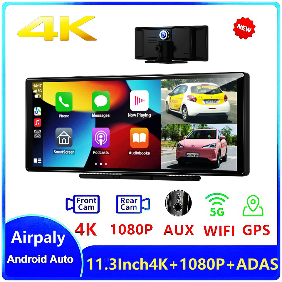 11.26 Inch 4K DVR Wireless CarPlay & Android Auto Dash Cam Bluetooth Audio GPS Navigation Dashboard Dual Lens Video Recorder